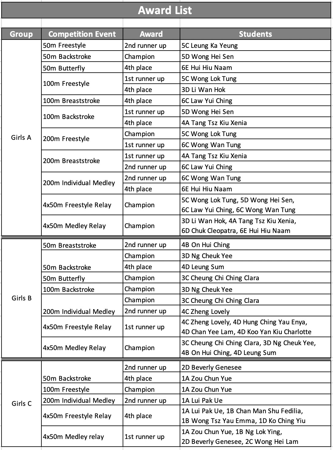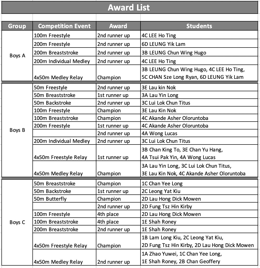 Congratulations to our PE Swimming Team for outstanding achievements in a HKSSF Inter-school Swimming Competition.