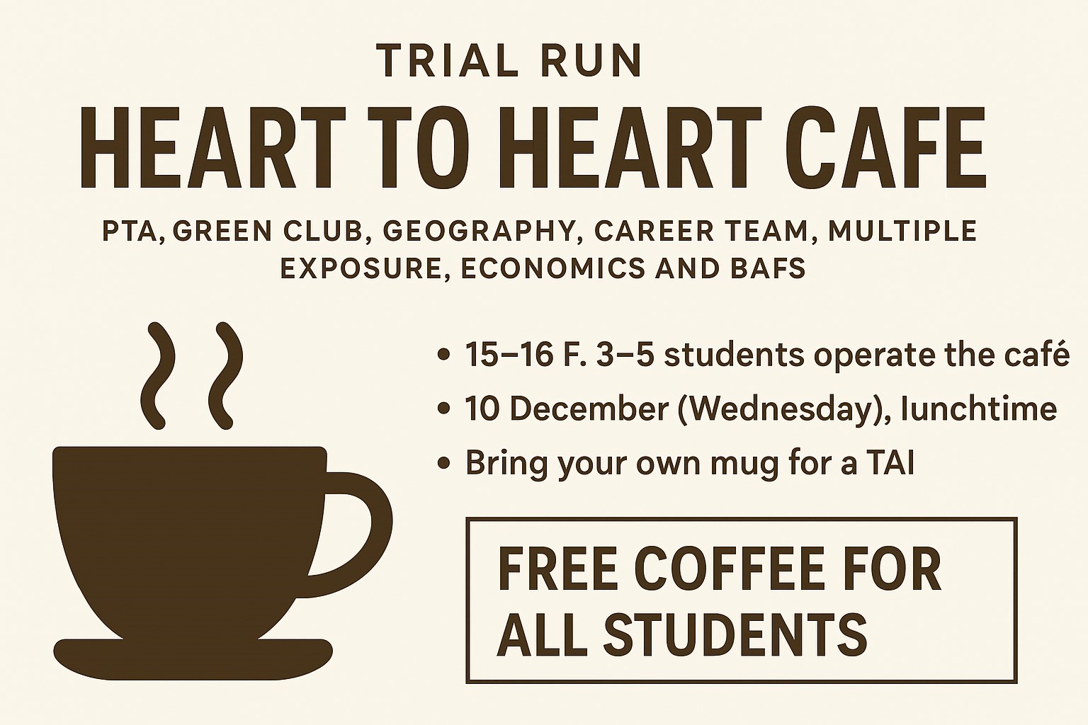 The Heart to Heart Café is a collaborative learning initiative involving Geography, Green Club, Career Team, Multiple Exposure, Economics, and BAFS. A team of 15–16 students from F.3–5 will operate the café at the PTA Room (325), with a trial run on 10 December and full operation during Open Day on 21 December. Coffee residue will be recycled, and students bringing their own mug will be rewarded a TAI to promote environmental stewardship. In the second term, the project will expand, allowing students to manage the budget and apply real operational management skills in café operations.